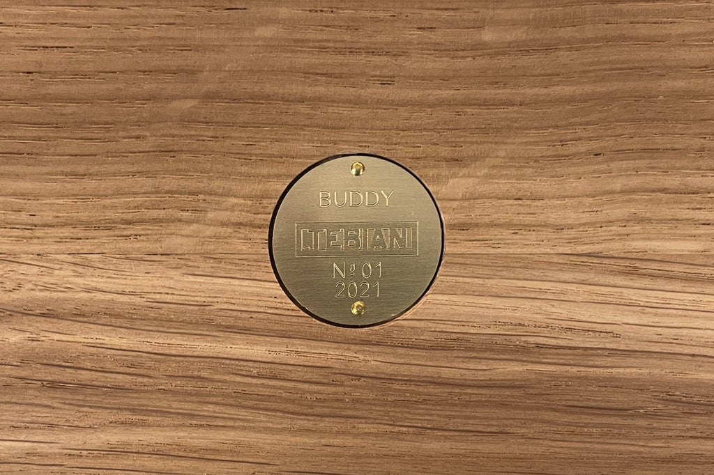 "Koin voimakkaasti tarvitsevani jonkun hyvin henkilökohtaisen hankkeen johon kanavoisin tiettyä patoutunutta energiaani. Tutkien, löytäen, luoden ja leikitellen nivoisin yhteen itseäni viehättäviä asioita saaden aikaan jotain hurmaavaa. Prosessin jälkeen syntyi teos nimeltä Buddy. Tunsin valtavan suurta täyttymystä ja iloa kun edessäni oli valmiina itselleni tekemä ensimmäinen kappale. 21 kiloa painava umpitamminen Buddy valmistetaan käsin yksilöllisesti tehtynä, ja tarkasti viimeisteltynä. Sileällä pinnalla on luonnonmukainen öljyseos, joka korostaa puun kauneutta tuoden vielä yhden ulottuvuuden lisää tähän harmooniseen teokseen. Lopuksi pohjaan upotetaan kahdella naulalla kiinni lyöden numeroitu messinkilaatta, jossa on yksilönumero ja vuosiluku. Kun lopuksi pohjaan on kahdella naulalla kiinni lyöden upotettu yksilönumeron ja vuosiluvun sisältävä messinkilaatta, on Buddy viimein valmis matkalle. Sellainen on valloittava Buddy."