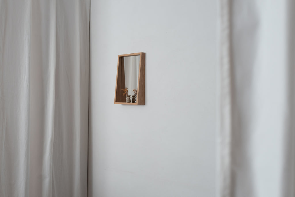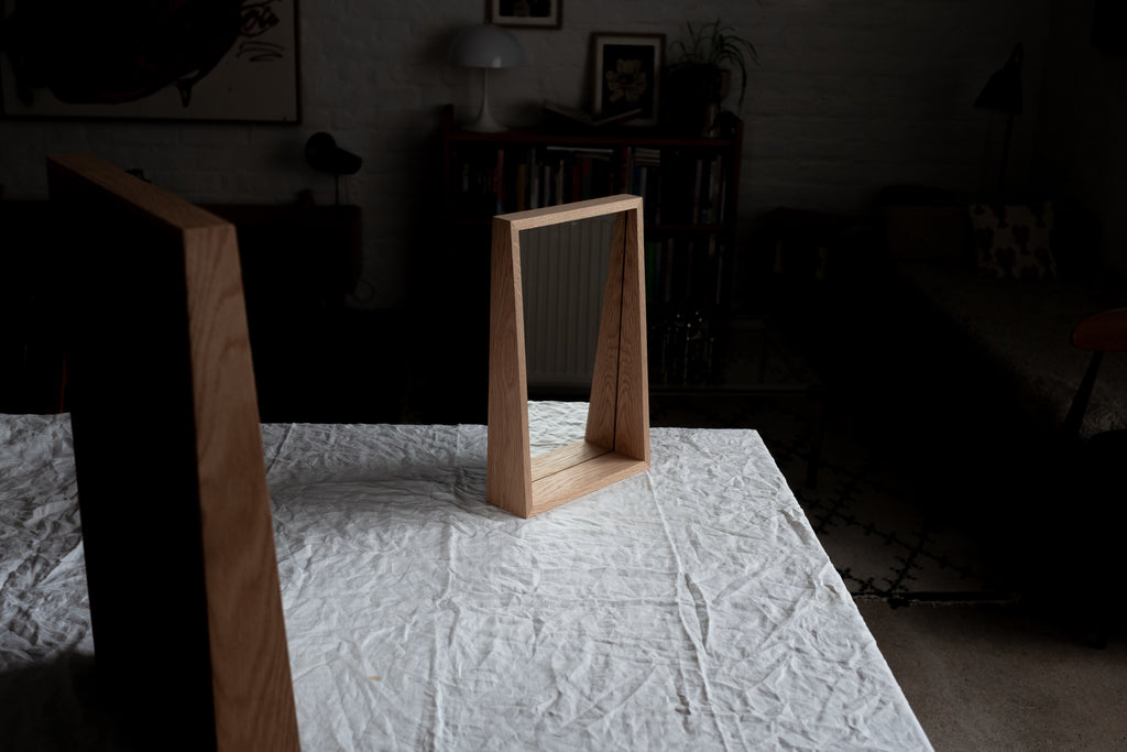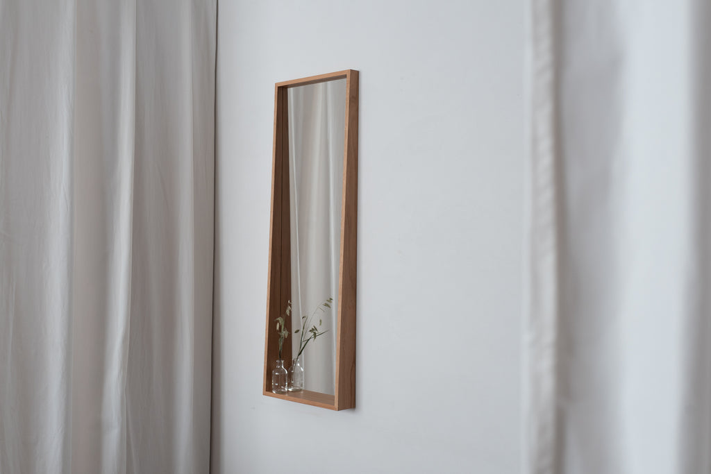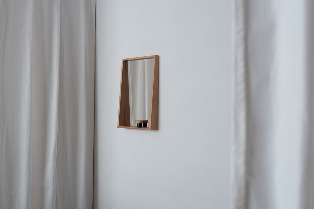 EKHO-peilin kehysten alaspäin levenevä muotoilu luo peilin alaosaan pienen hyllytason jolle voi laskea esimerkiksi korun tai maljakon. Peilin leveä alaosa mahdollistaa myös peilin siirtämisen seinältä pöydälle tai ikkunalaudalle pystyyn, juuri siihen sillä hetkellä parhaaseen valoon. Estetiikka kohtaa EKHOssa käytännön viehättävästi.