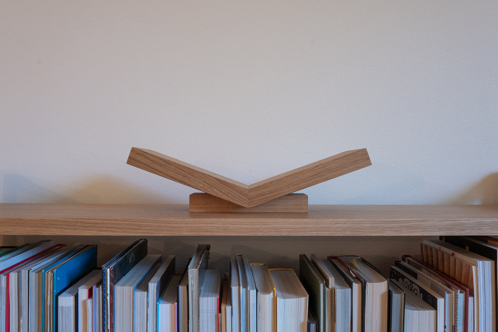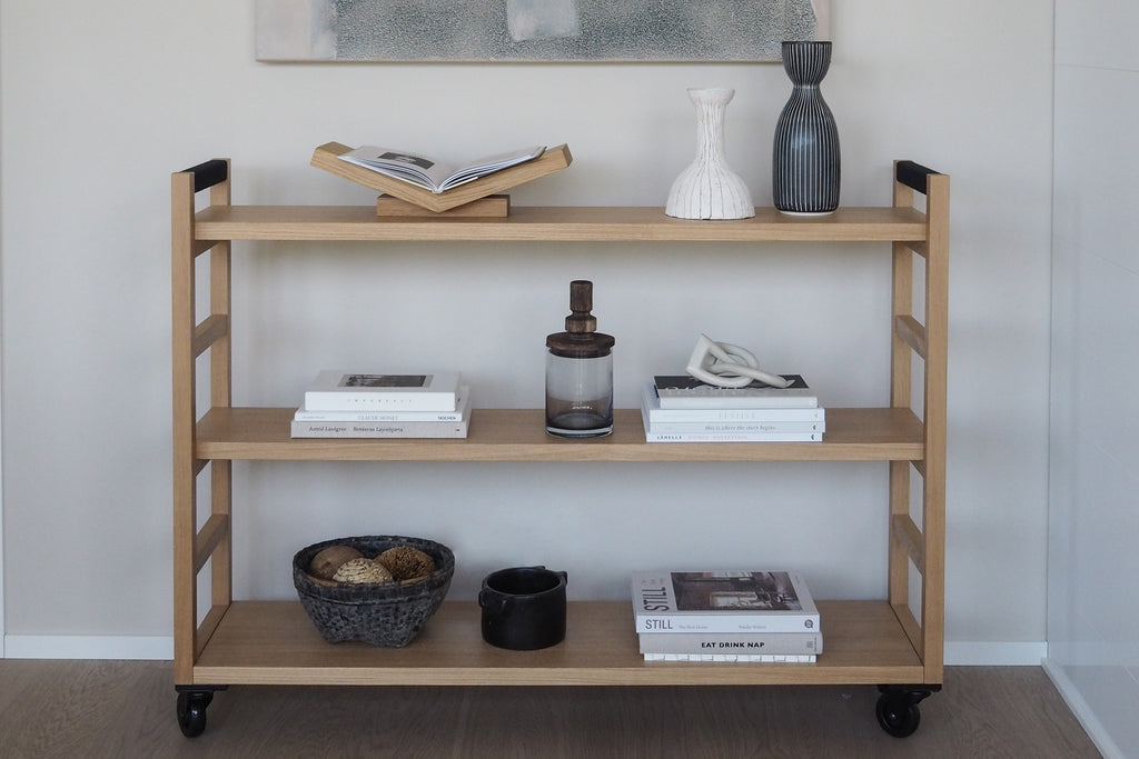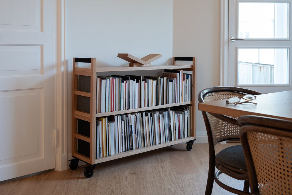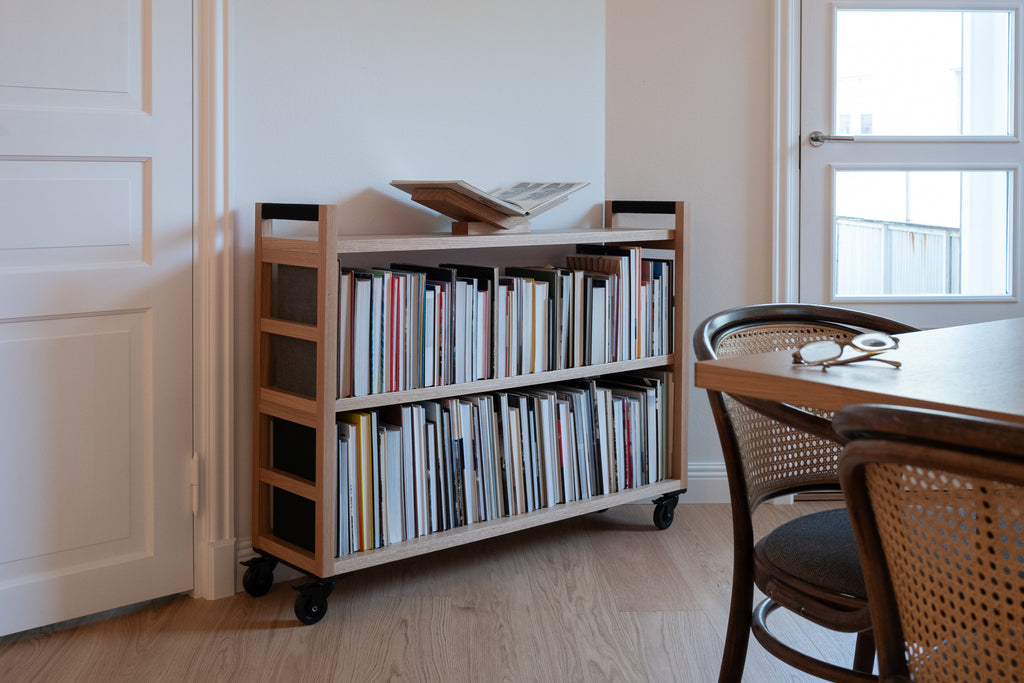 "Rizzolin kirjakauppa, New York Joulukuu 2018. Kädessäni on iso kasa kirjoja. Kaupan työntekijä sivuuttaa minut työntäen kirjakärryä. Katson perään ja mietin että miksi minulla ei ole kotona omaa kirjakärryä. Prosessi oli alkanut. Umpitammiset päätypuut kannattelevat vankkoja rimalevyrunkoisia paksulla tammiviilulla päällystettyjä hyllylevyjä. Kahvat on verhoiltu kierrätetystä puuvillasta tehdyllä narulla, ja koko komeus rullaa lukoilla varustettujen täyskumipyörien päällä. Veistoksellinen Leggo-lukuteline tuo etäisesti mieleen avoimen kirjan. Se on valmistettu umpitammesta ja toimii niin OPUS-kirjavaunun päällä kuin myös ihan itsekseen pöydällä. Leggo kannattelee sitä juuri sen hetken suosikki kirjaa jonka luokse voi hetkeksi unohtua."