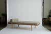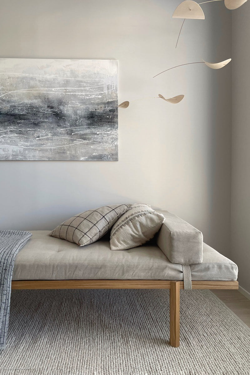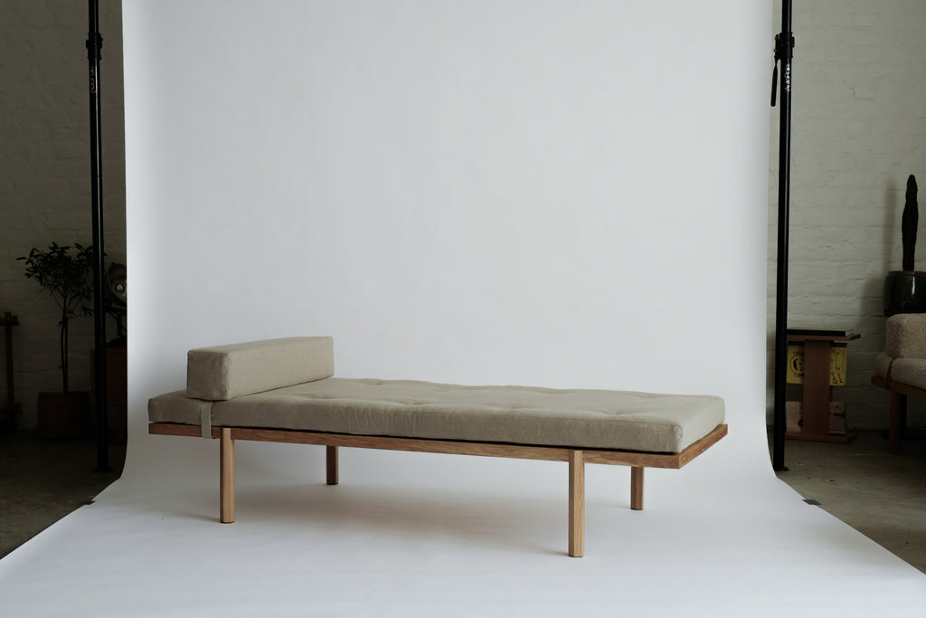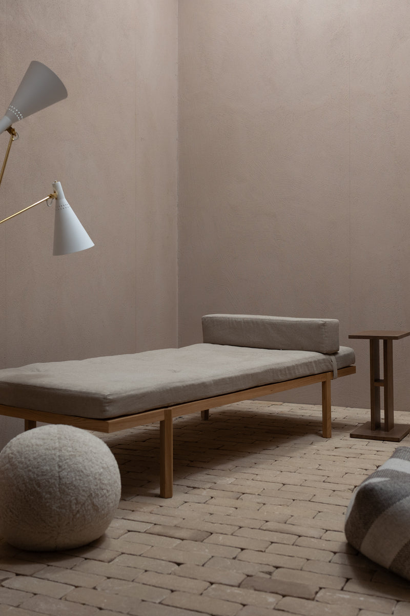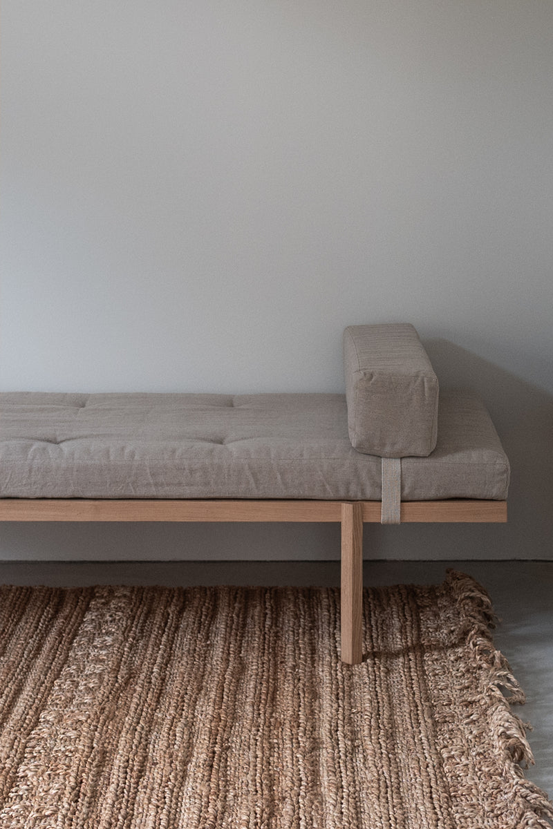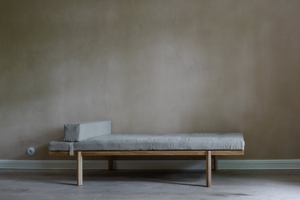 The futon model is made of PEFC-certified European oak and is made entirely of natural materials. It houses a futon mattress and pillow designed and manufactured for this purpose in collaboration with the Pori-based family business Villa & Peite. The coconut fiber, natural rubber, and wool structure upholstered in dark linen fabric guarantee a breathable, natural, high-quality end result that has 0 VOC emissions. Thanks to its size and removable pillow, Amélie also offers a place to sleep for those who need it.