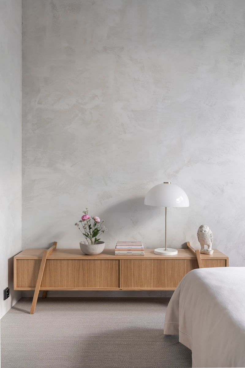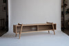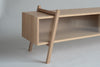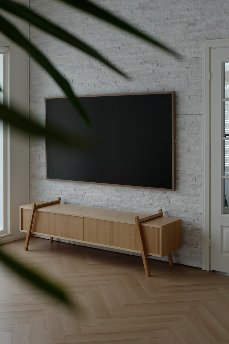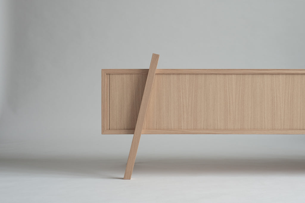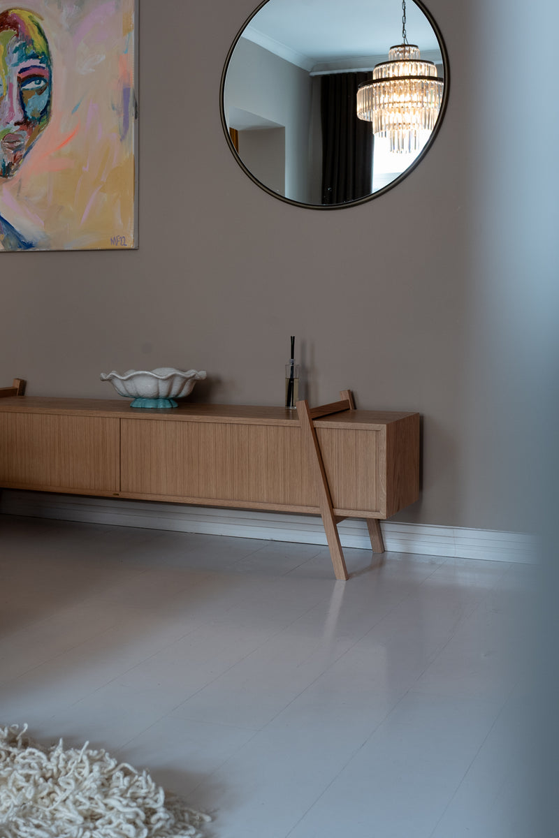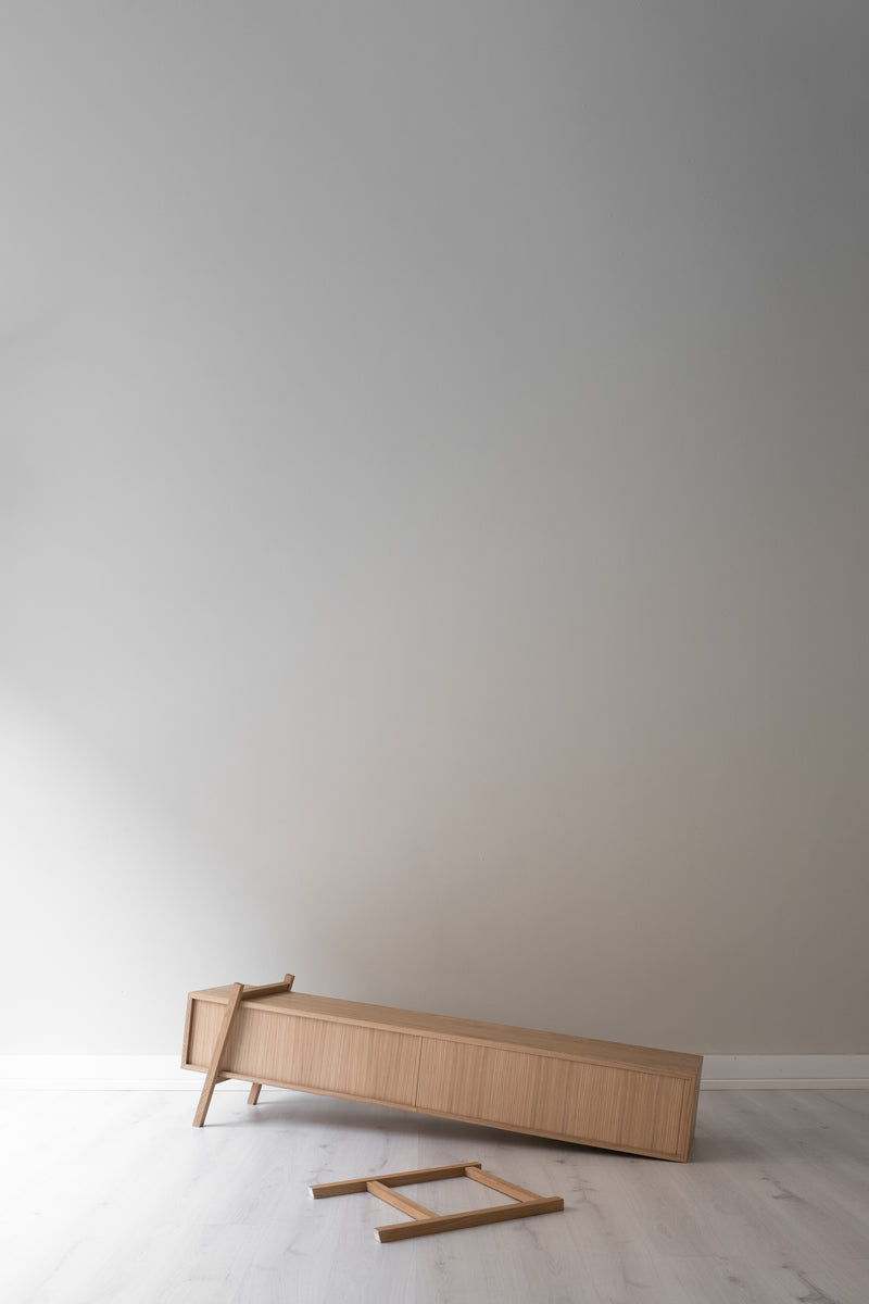 This sleek piece of furniture, inspired by 1950s design, works well as a TV stand or even a bedroom side table, offering its owner the opportunity to change its own appearance. Small movements of the legs or removal of the doors can have a big impact on its character and the spirit of the space.