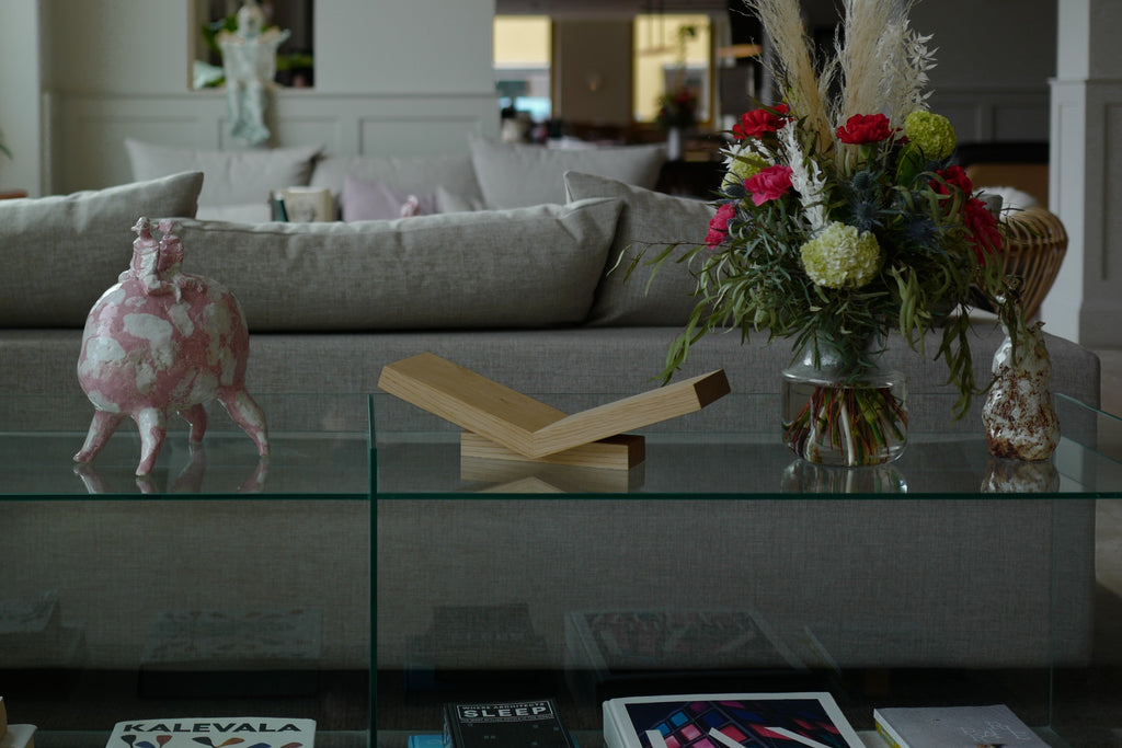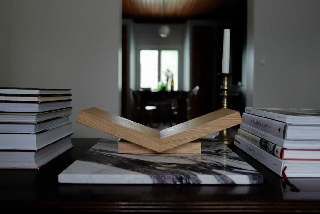 Umpitammesta valmistettu Leggo sai muotonsa avoimesta kirjasta. Alunperin Opus-kirjavaunun ylähyllylle suunniteltu lukuteline toimii eri pöydillä, työtasoilla, milloin missäkin. Itselläni onkin aina jokin valokuvakirja Leggossa selailtavana.